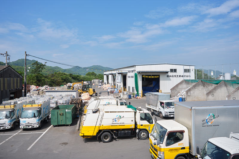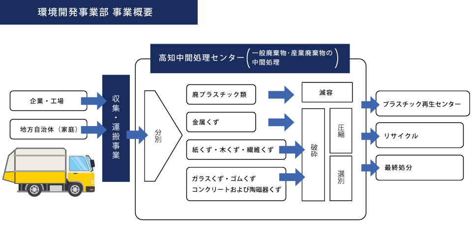 事業活動の中核施設である「高知中間処理センター」は南国市および高知市近郊のための収集運搬用の車両基地であり、センター内工場では一般廃棄物・産業廃棄物の破砕・圧縮・選別をおこなっております。