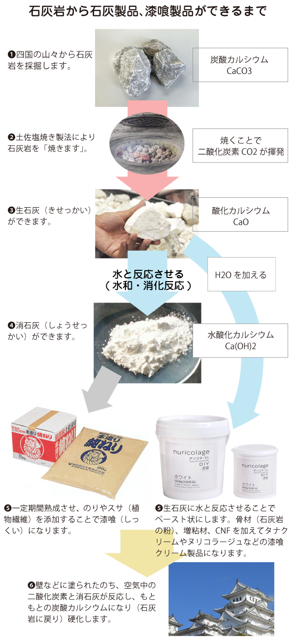 石灰には大別して2種類、生石灰(酸化カルシウム[CaO])と消石灰(水酸化カルシウム[Ca(OH)2])があります。生石灰は原料の石灰岩を高温で焼いて製造します。この生石灰を水と反応させると高熱を発して消石灰が出来ます。