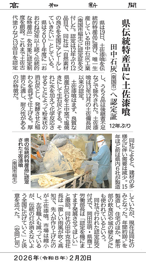 2/19(木)高知で独自に発展した漆喰「土佐漆喰」が高知県伝統的特産品に認定され、認定書交付式が執り行われました。